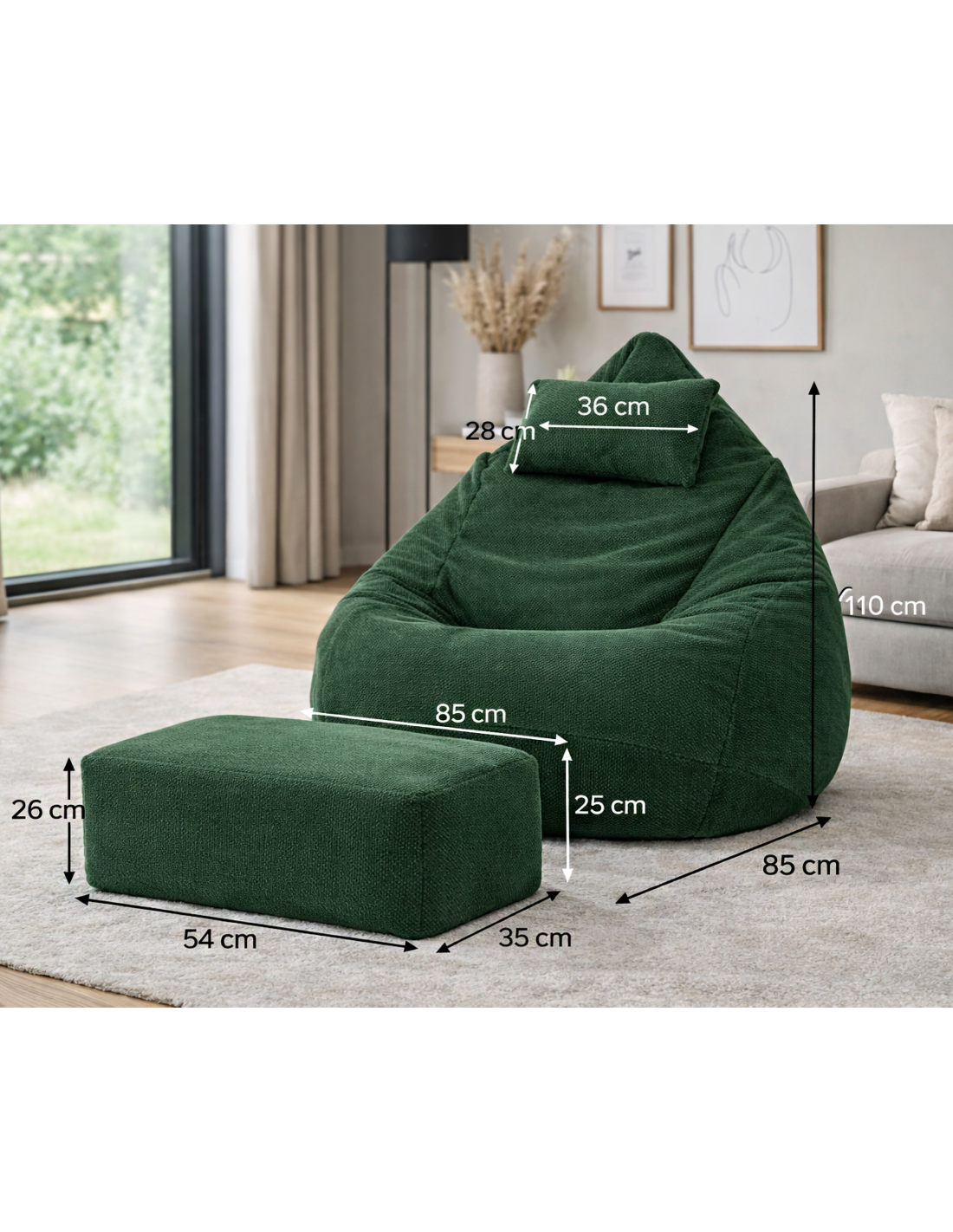 Súčasťou setu je aj samostatný vankúš na hlavu, ktorý výrazne zvyšuje komfort pri dlhšom sedení. Na rozdiel od sedacieho vaku nie je potrebné ho dopĺňať granulátom. Vankúš je plnený ekologickou antialergickou vatou, ktorá je schválená podľa noriem EÚ. Je vhodný aj pre citlivejších používateľov a rodiny s deťmi.