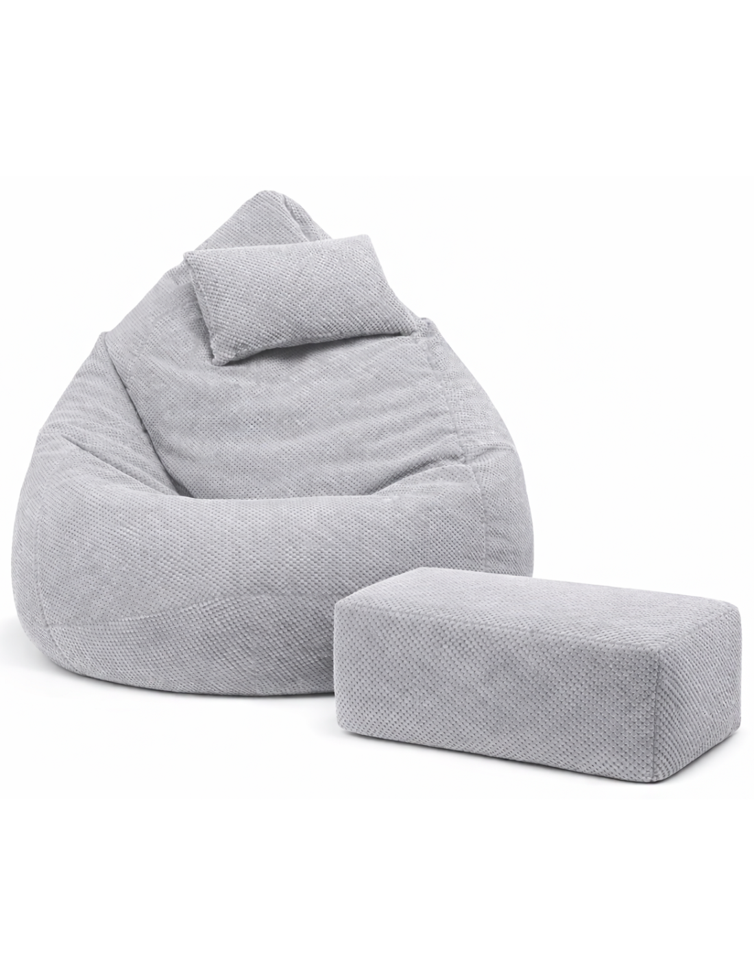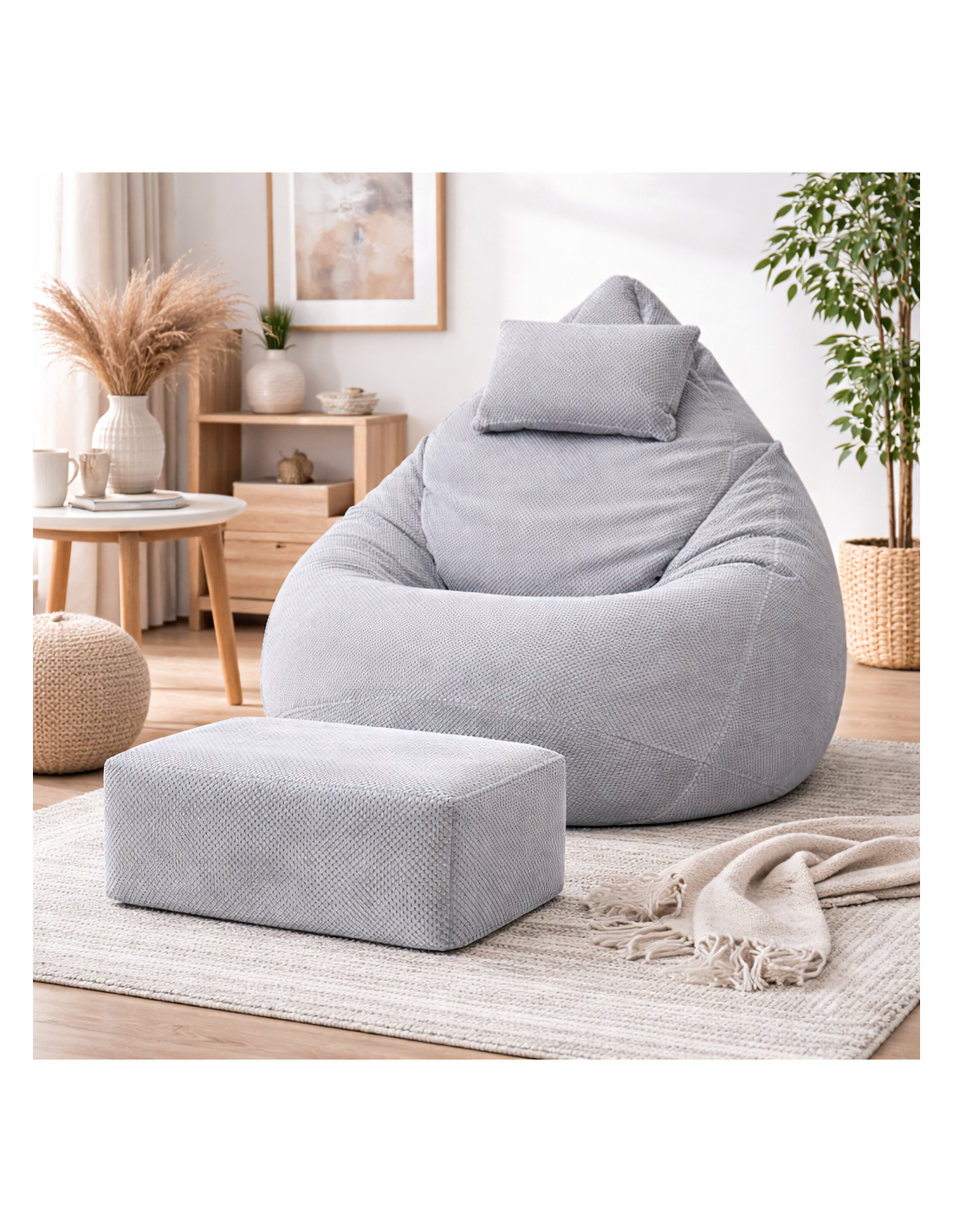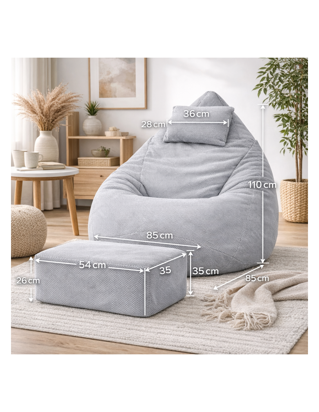 DOT RELAX GRANDE je veľký prémiový sedací vak, ktorý bol navrhnutý pre skutočný relax bez kompromisov. V jednom produkte získavaš kompletný relax set – veľký sedací vak, pohodlnú podnožku na nohy a samostatný vankúš na hlavu. Nemusíš nič dokupovať, všetko máš hneď.