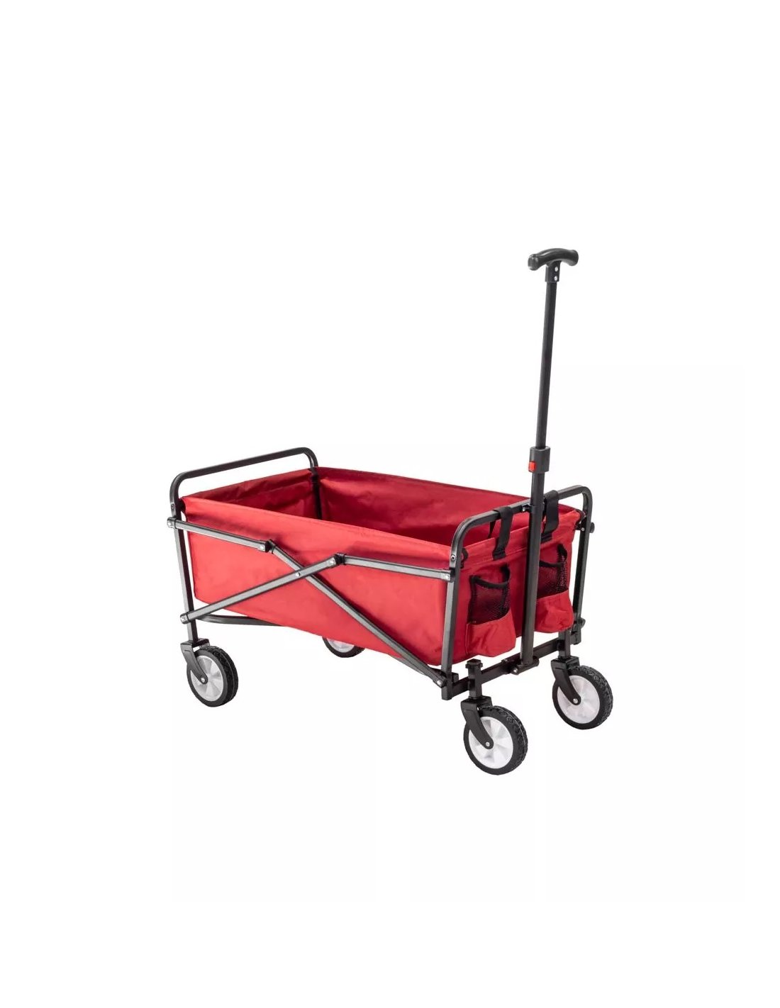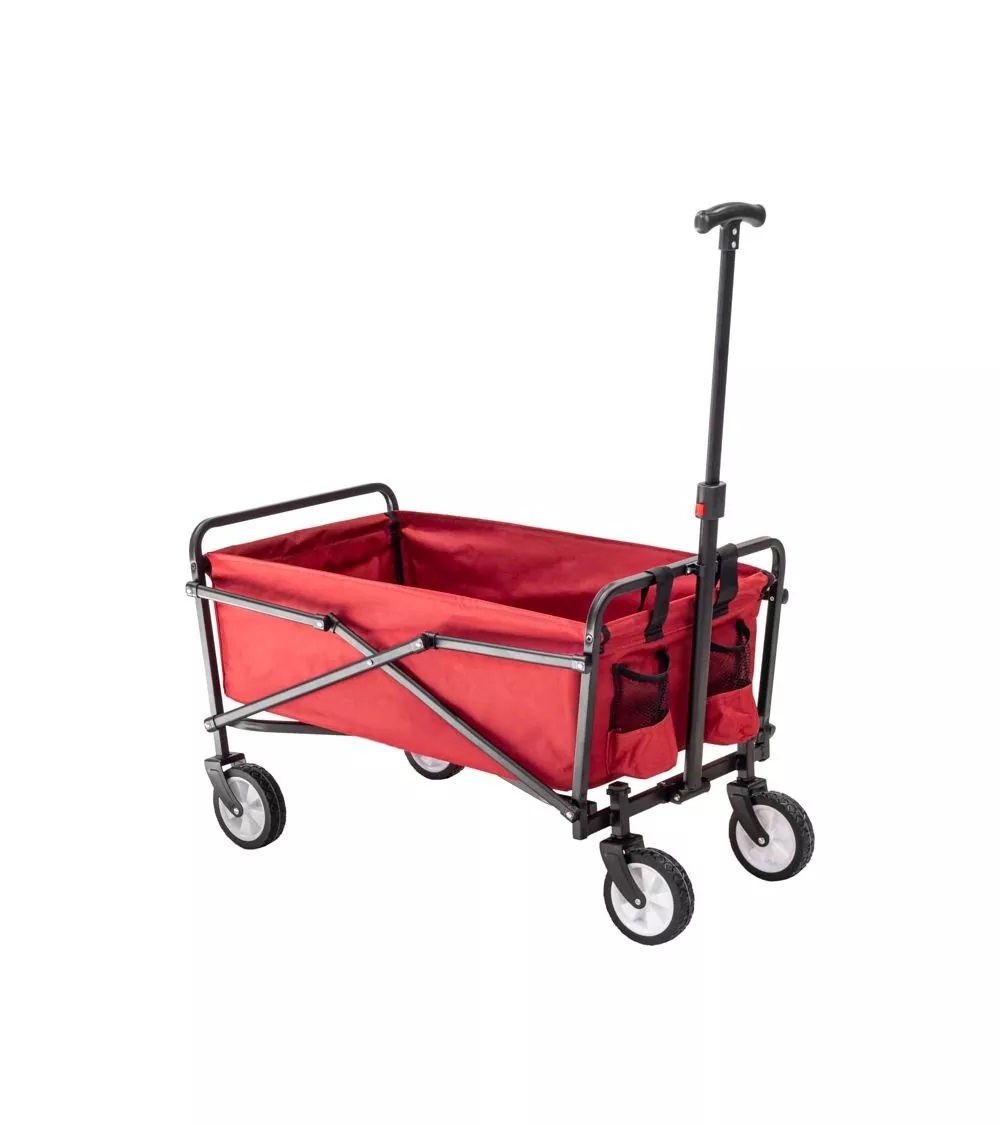 Červený skladací transportný vozík je nápomocný pri preprave nákladov do 60 kg.