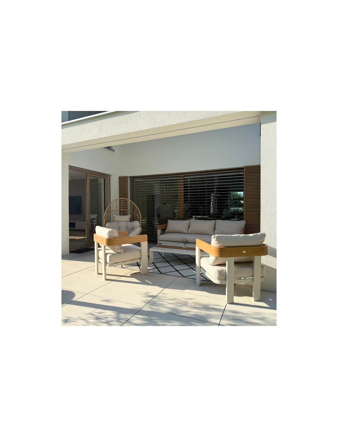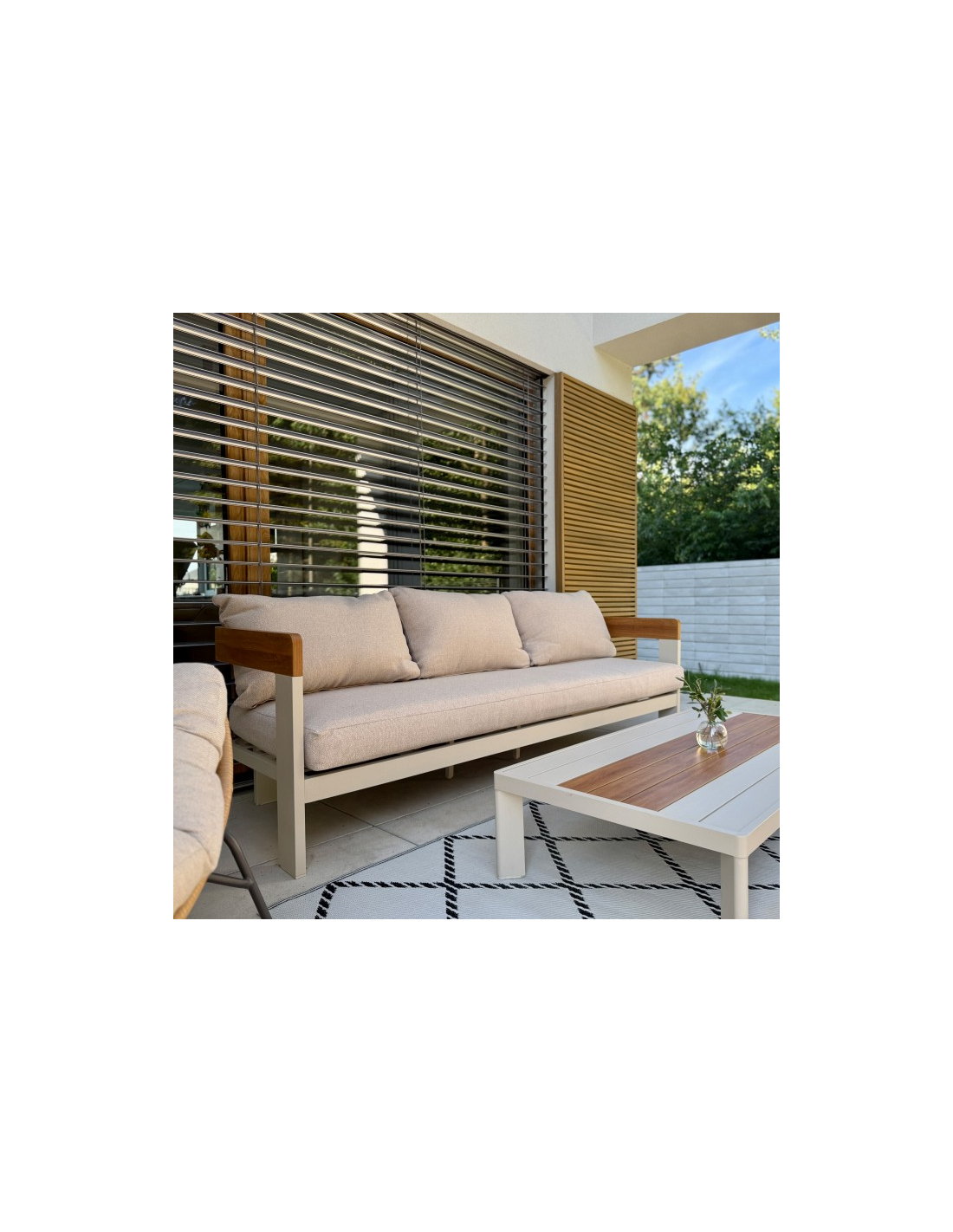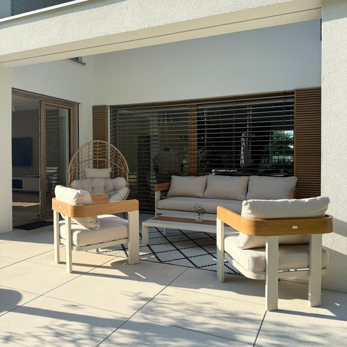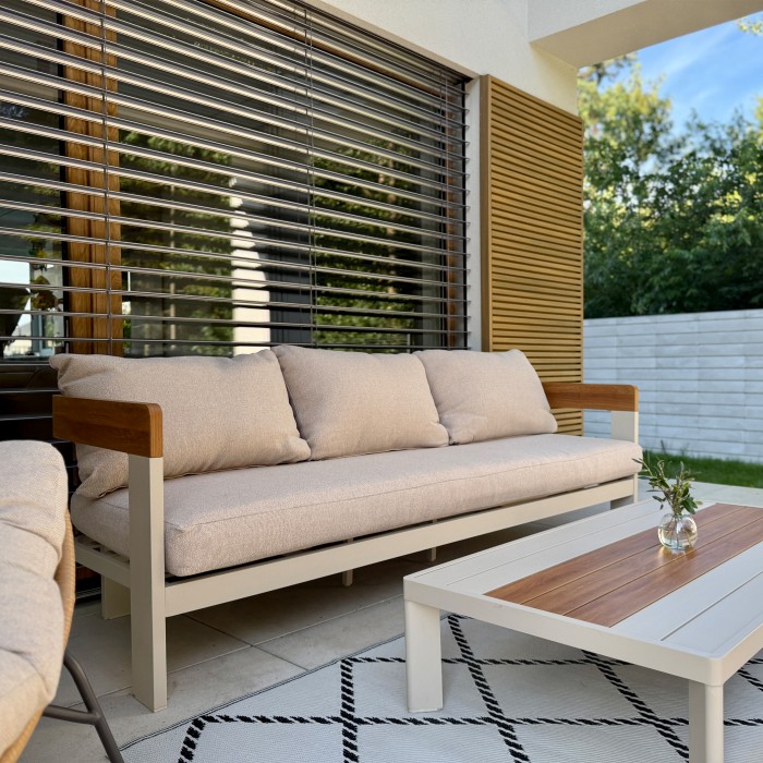 Záhradný nábytok Molto kombinuje moderný dizajn s výnimočnou funkčnosťou. Práškovo lakovaný hliníkový rám poskytuje nielen elegantný vzhľad, ale aj vysokú odolnosť proti korózii, čo zaručuje dlhú životnosť aj pri intenzívnom používaní vonku. Tepelne vodivý náter dodáva rámu prirodzený drevený efekt, čím vytvára elegantný, no zároveň moderný vzhľad. Béžová farba je neutrálna a všestranná, vďaka čomu je vhodná do rôznych prostredí.