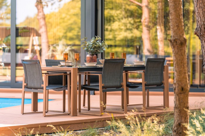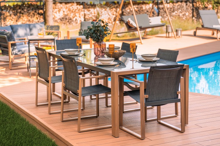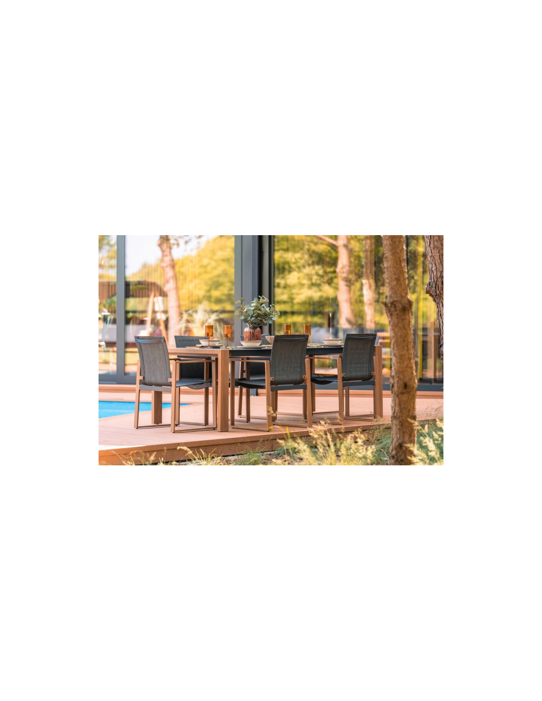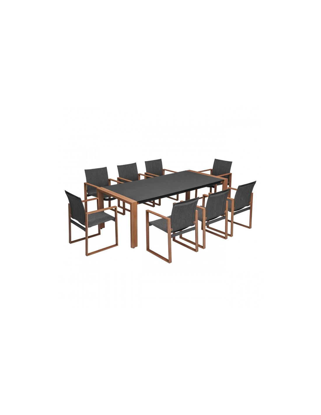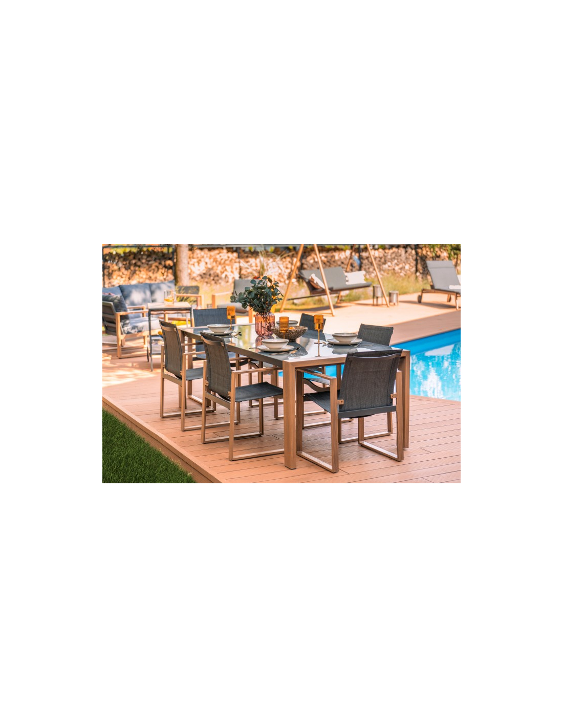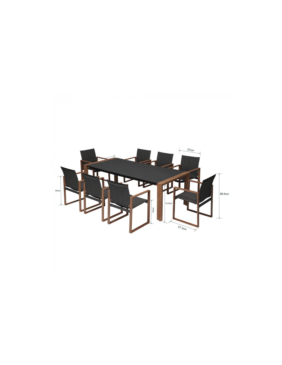 Tento veľký jedálenský set s 8 stoličkami a pevným stolom je ideálny pre milovníkov vonkajšieho stolovania. Táto 8-miestna súprava je ideálna na rodinné večere a stretnutia s priateľmi. Hliníkový rám zaisťuje stabilitu a je odolný voči korózii, čo zaručuje trvácnosť nábytku. Kľúčovým prvkom súpravy je veľký stôl s praktickou doskou z tvrdeného skla odolnou voči poškriabaniu. Stoličky sú navrhnuté tak, aby poskytovali pohodlné sedenie. Pohodlné podrúčky poskytujú pohodlnú opierku. Vďaka použitým materiálom vám nábytok vydrží mnoho sezón.